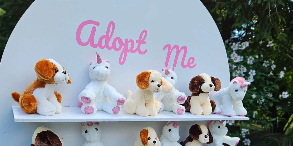 Our Adopt a Friend Party is a heartwarming, hands on experience where each guest chooses their very own plush pal from our charming “Favor Wall.” The wall is personalized with custom vinyl to match your party theme, creating an eye catching display that doubles as décor and a fun adoption station.
